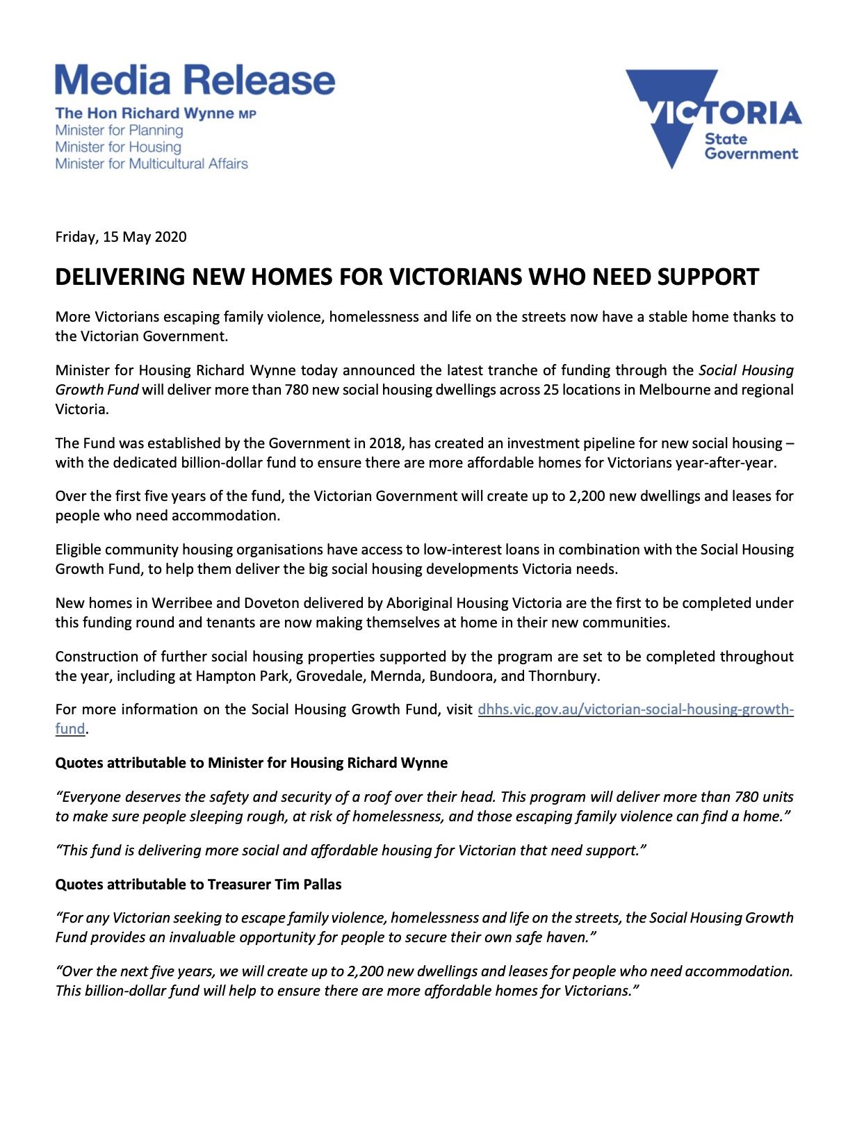 The media release also stated eligible community housing organisations will have access to low-interest loans in combination with the Social Housing Growth Fund, helping them deliver the social housing developments Victoria needs.